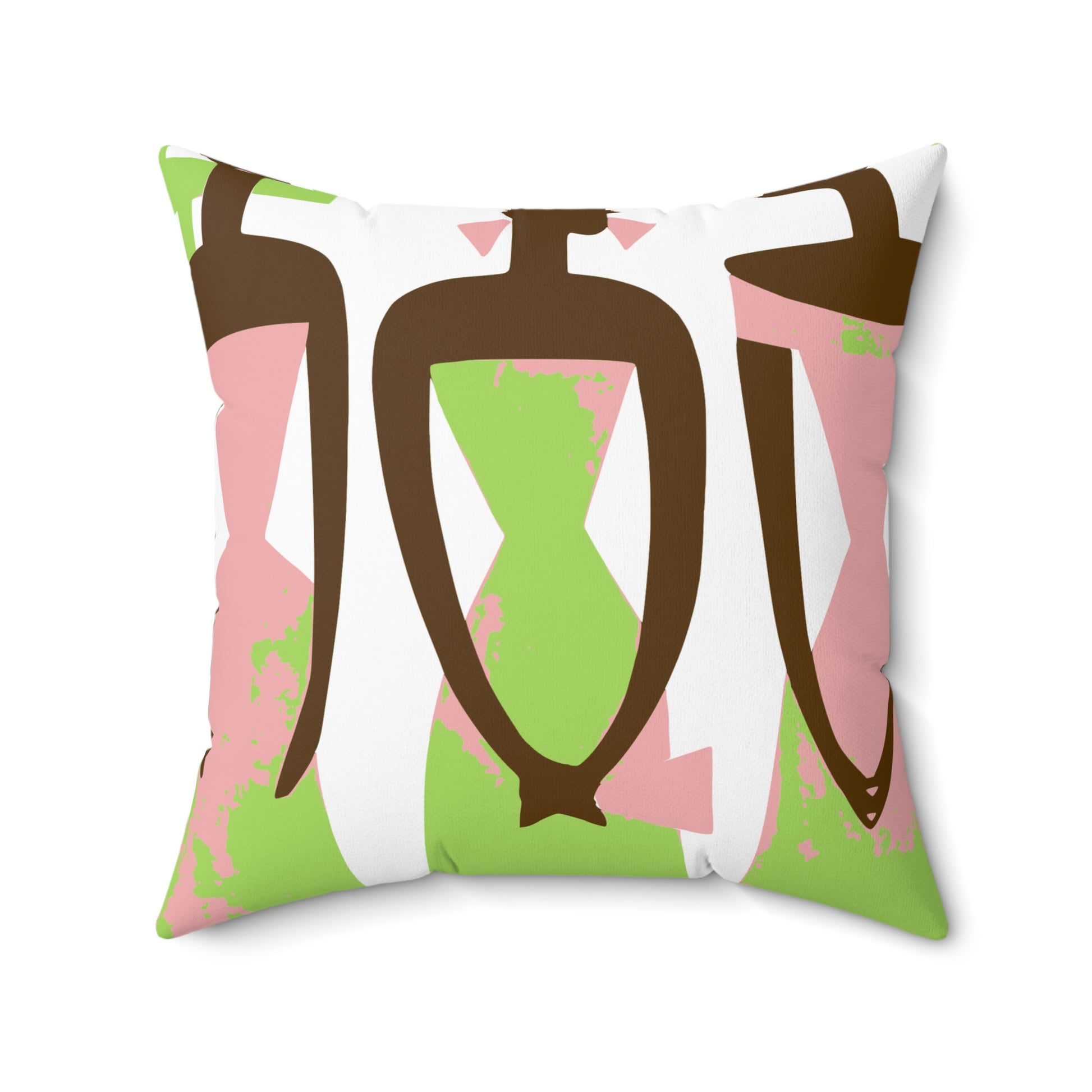 The artwork on this pillow is a celebration of the rich heritage and unity found within the AKA sorority. William H. Johnson's influence is evident in the vibrant colors, dynamic flat shapes, and graceful distorted compositons that adorn the fabric. The double-sided print ensures that the eye-catching design is visible from any angle, adding a dynamic and visually appealing touch to any space.